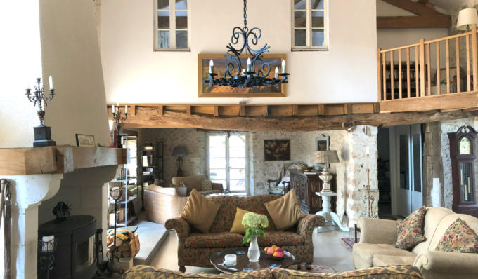 No photo can capture it…We designed the lounge to occupy more or less the whole barn area with only our mezzanine bedroom interrupting the high ceilings. In discussion with the builder Andrew, we agreed that we should provide a focus in the room with a new fireplace and chimney (previously un-budgeted for obviously). This really helped orientate the room as did the big wood burning “poêle” from Leroy Merlin (we deserve a platinum loyalty card for what we’ve spent in Leroy - pronounced Le Roi ). This was installed with the two large reversible ceiling fans (I’ll spare you the Malcolm explanation of why), suffice to say they help keep you cool in summer and warm in winter. After a long debate we decided to leave the floor with the naturally semi-polished concrete. After adding a few stencilled faded tiles and the odd Manchester bee, the whole floor was industrially varnished. The effect is enhanced by our Turkish and Moroccan rugs. The pièce de résistance was the wrought iron chandelier, found, negotiated and purchased from a brocante for Malcolm’s 70th. It only needed cleaning of rust, repainting and the full electrics redoing. Oh and lifting up (it weighs 30 kilos) to hang from the high rafters. I think he was actually a bit ungrateful! at first!You will also spot the odd feature of internal, old, originally external windows from the two bedrooms looking into the lounge, plus original “bent” beam left in place to support the mezzanine floor