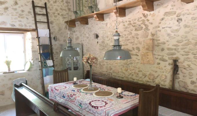We planned to be here in the winter sometimes, so needed indoor dining as well as outside. So we used our old oak dining/refectory table from Knutsford (one day to have end extensions made) together with 2 fabulous church pews. One supplied by Pat and Lee and one by my mum from her church when they were changing to chairs. The pews were cut to match in length. The setup is complemented by 2 industrial lights from the Cheshire Salvage Show that Malcolm duly refurbished for standard sized lightbulbs. The pew cushions were made on the Wirral by a lovely lady who thought, due to a misunderstanding, that they were destined for a church in France where my husband was a vicar! I used a ladder from the barn to show off the mainly Turkish and French table cloths and one of Pat’s mirrored stands which I painted, plus an eBay corner unit and we were ready to eat!The shelf above and supporting “beams” are set at the original barn floor height, but now just need to support the junk shop find of a procession of elephants….In the pictures below, you can see the original oil fired boiler located where the table now is. Plus the insulation, reinforcing and cable ducting now hidden in the concrete floor.